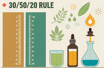 The 30/50/20 rule isn't a standard scientific term, but it's often used to suggest safe dilution and storage habits: 30% dilution max for strong oils, 50% cool/dark storage, and 20% air space in bottles.