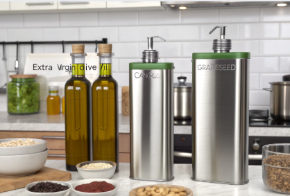 aceite de oliva, aceite de aguacate, aceite de uva , y aceite de sésamo todos se benefician de la protección contra el calor, la luz y el oxígeno para evitar el aceite rancio. Una botella adecuada extiende la vida útil , preserva el sabor , y ayuda a mantener valor nutricional .