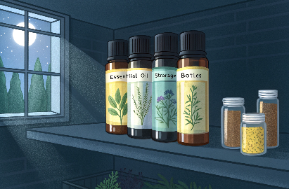Los aceites esenciales deben almacenarse en botellas de vidrio oscuro, de color ámbar o azul cobalto, en un lugar fresco, seco y oscuro lejos de la luz solar y las fluctuaciones de temperatura.
