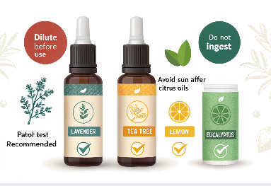 Ключевые меры предосторожности включают разбавив масла перед тематическим использованием, хранение их в стекле вдали от солнечного света, избегая проглатывания без профессионального надзора и выполнения теста на патч перед полным применением.