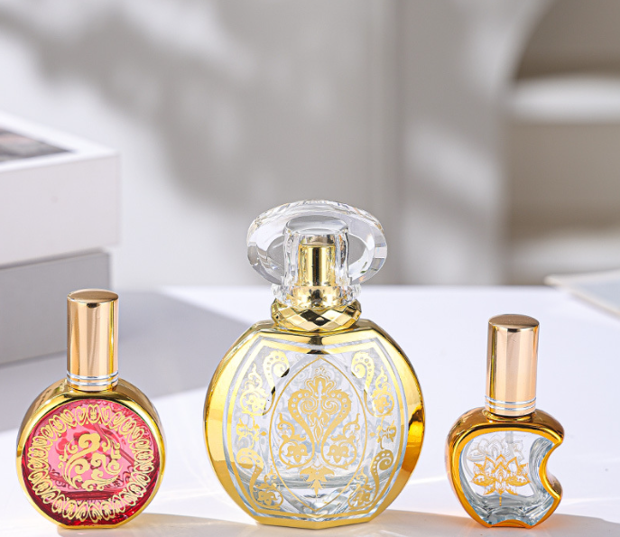 A luxury gold-plated engraved glass bottle with silk-printed patterns, designed for fragrance water and essential oils, ideal for multi-serving storage and dispensing.